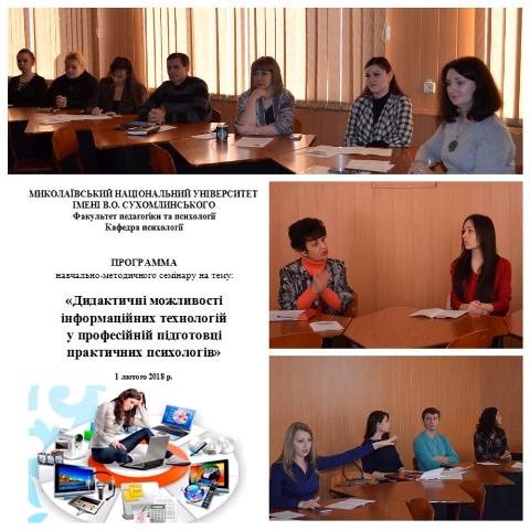 1 лютого 2018 р. викладачем кафедри психології Л.А. Опанасенко організовано та проведено навчально-методичний семінар «Дидактичні можливості інформаційних технологій у професійній підготовці практичних психологів». Його активними учасниками стали: науково-педагогічні працівники кафедри психології: Савенкова І.І., Шевченко В.В., Кучманич І.М., Чугуєва І.Є., Литвиненко І.С., Опанасенко Л.А, Санько К.О., Мухіна Л.М.; доцент кафедри соціальної роботи – Прасол Д.В.; консультант психологічної консультації Центру психологічної служби університету – Гулькова Д.С.; студенти 3-7 курсів спеціальності «Психологія»: Плахтій М.В., Лисогор А.В., Касьянова Н.М, Степанюк Л.С., Любінецька Г.Л., Полєшко Н.С.