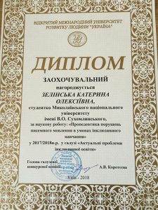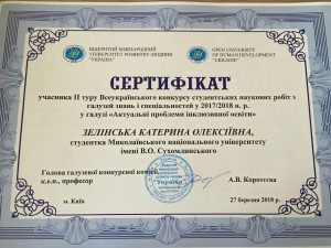 27 березня 2018 року у м. Київ відбувся ІІ тур Всеукраїнського конкурсу студентських наукових робіт у галузі «Актуальні проблеми інклюзивної освіти». Студентка спеціальності «Спеціальна освіта» Зелінська Катерина під керівництвом завідувача кафедри спеціальної освіти, доктора педагогічних наук, професора Савінової Наталії Володимирівни блискуче представила результати свого дослідження і отримала сертифікат учасника та заохочувальний диплом