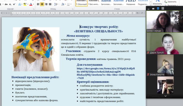 Під такою назвою вже втретє проведено конкурс студентських творчих робіт, цього року в форматі онлайн. Конкурс проводиться кафедрою спеціальної освіти з ініціативи к. пед. н., доцента І. В. Середи з метою популяризації спеціальності та залучення студентів до профорієнтаційної роботи. 27 квітня студенти другого курсу спеціальності 016 Спеціальна освіта представляли своє бачення майбутньої професії у різних формах: відеоролик, презентація, буклет, поетичний твір та ін. Студенти разом із викладачами кафедри жваво обговорювали переваги і труднощі професії, можливості практичної діяльності і творчого розвитку студентів, визначали найкращі роботи в кожній номінації.